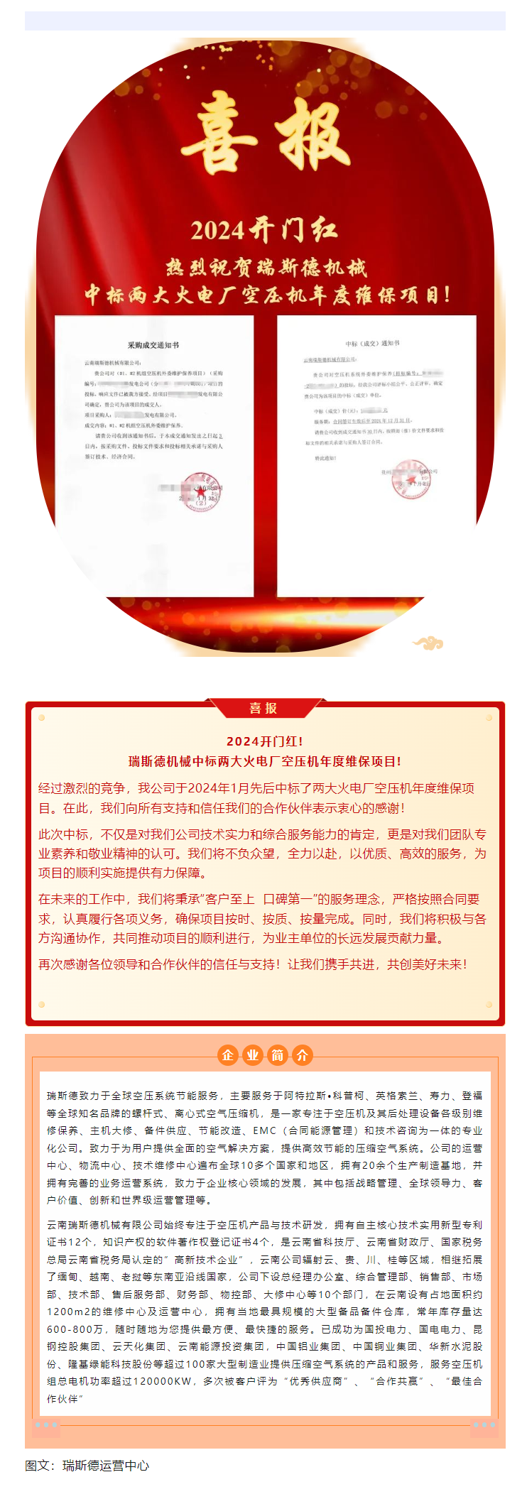 【喜報】開門紅!瑞斯德機械中標兩大火電廠空壓機年度維保項目!